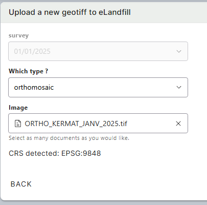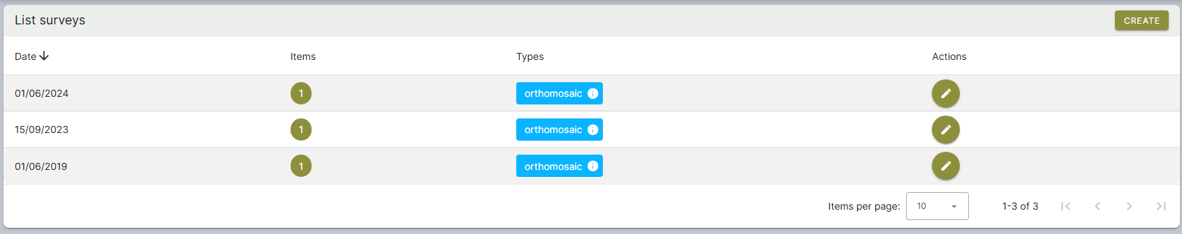 In the Survey module, you are able to create and manage surveys and upload new files. During the import, files (.tif) will be analysed, reprojected and compressed for display optimization.